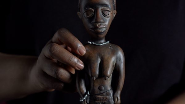 In our meeting on campus Ayobami told me about her encounter in the Sainsbury Centre for Visual Arts with a statue in their collection. She had just arrived in Norwich from Lagos to take up her position on the MA course and was by her own admission in a state of culture shock. She experienced another kind of shock in the cool grey interiors of the SCVA that day, one of recognition. The statue she saw there was from her own region of Nigeria. It was an Ibeji, a sacred statue sometimes carved when one of two twins dies. Little did she know that eight years later that statue would be brought to life in her ambitious, sensitive and necessary narrative about origins, exile and ownership, as well as family ties which stretch across generations and nations.