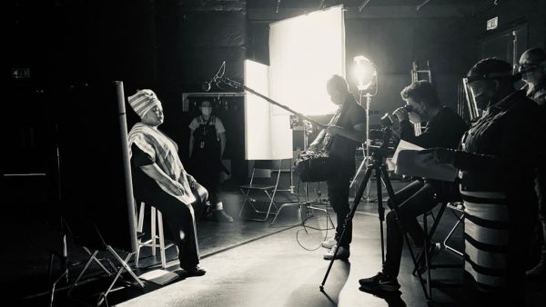 Provenance, by Ayobami Adebayo, was entirely devised over Zoom with multiple scripts passing backwards and forwards. Both Sophie Mellor and Marcus Romer played a key role in producing scripts and visual treatments for the work in progress. The central story idea was shaped early on, but of course the elaborations of a novel (script outline) could not be achieved on the budget and within COVID. Sophie and I have worked on a number of three screen installations and we felt this might work as a way to present the work. From this point, Marcus worked closely to devise out a script that could be shot either in Lagos or Norwich. As the second wave hit the UK, it became clear that our best intentions to do this were not feasible. The devising process eventually led us to a way to shoot a restricted number of actors in a COVID secure studio at Riverside Studios in London and to use a Nigerian illustrator, Osaze Amadasun, to convey the historical narrative. Provenance really is a film about what can be done in a pandemic. Marcus cast and crewed the shoot, with academic lead Professor Jean McNeil attending. Lateral flow tests and wiping down of props and kit had to be factored in.